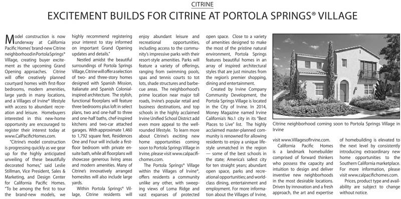 enjoy abundant leisure and recreational opportunities, including access to the community’simpressiveparks with their resort-style amenities. Parks will feature a variety of offerings, ranging from swimming pools, spas and tennis courts to tot lots,shade structures and barbecue areas. The neighborhood’s prime location near major toll roads, Irvine’s popular retail and business destinations, and top schools in the highly acclaimed Irvine unified School Districtadd even more appeal to the wellrounded lifestyle. To learn more about Citrine’s exciting new home opportunities coming soon to Portola Springs Village in Irvine,please visit www.calpacifichomes.com.