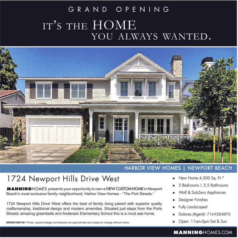 G R A N D O P E N I N G I T ’ S T H E H O M E YO U A LWAY S WA N T E D . HARBOR VIEW HOMES | NEWPORT BEACH 1724 Newport Hills Drive West presents your opportunity to own a NEWCUSTOMHOME in Newport Beach’s most exclusive family neighborhood, Harbor View Homes - “The Port Streets.” New Home 4,300 Sq. Ft.* 5 Bedrooms | 5.5 Bathrooms Wolf & SubZero Appliances 1724 Newport Hills Drive West offers the best of family living paired with superior quality craftsmanship, traditional design and modern amenities. Situated just steps from the Ports Streets’ amazing greenbelts and Andersen Elementary School this is a must see home. Designer Finishes Fully Landscaped Dolores (Agent): 714-928-8870 BRE#01000146 *Prices, square footage and features are approximate and subject to change without notice. Open: 11am-5pm Sat & Sun