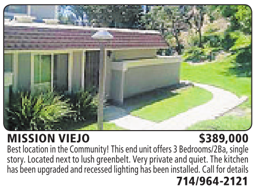 MISSION VIEJO $389,000 Best location in theCommunity! This endunitoffers3Bedrooms/2Ba,single story. Located next to lush greenbelt.Veryprivate andquiet. Thekitchen hasbeen upgraded andrecessed lighting has beeninstalled. Call for details 714/964-2121
