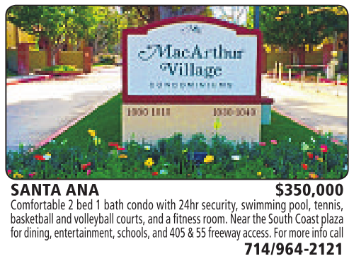 SANTA ANA $350,000 Comfortable 2bed 1bath condo with 24hr security, swimming pool, tennis, basketball and volleyball courts, andafitnessroom. Near theSouth Coastplaza fordining, entertainment, schools,and 405&55freeway access.For more info call 714/964-2121