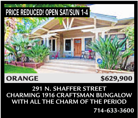 291 N. SHAFFER STREET CHARMING 1916 CRAFTSMAN BUNGALOW WITH ALL THE CHARM OF THE PERIOD 714-633-3600