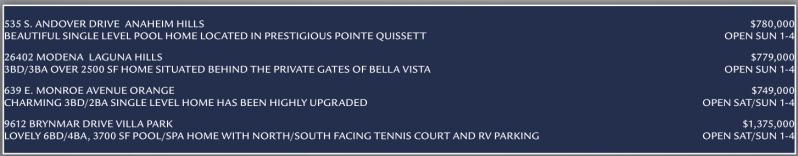 535 S.ANDOVER DRIVE ANAHEIM HILLS $780,000 BEAUTIFUL SINGLE LEVEL POOL HOMELOCATED IN PRESTIGIOUS POINTE QUISSETT OPEN SUN 1-4 26402 MODENA LAGUNA HILLS $779,000 3BD/3BA OVER 2500 SFHOME SITUATED BEHIND THE PRIVATE GATES OF BELLA VISTA OPEN SUN 1-4 639 E.MONROE AVENUE ORANGE $749,000 CHARMING 3BD/2BA SINGLE LEVEL HOME HAS BEEN HIGHLY UPGRADED OPEN SAT/SUN 1-4 9612 BRYNMAR DRIVE VILLA PARK $1,375,000 LOVELY 6BD/4BA, 3700 SFPOOL/SPA HOME WITH NORTH/SOUTH FACING TENNIS COURT AND RV PARKING OPEN SAT/SUN 1-4