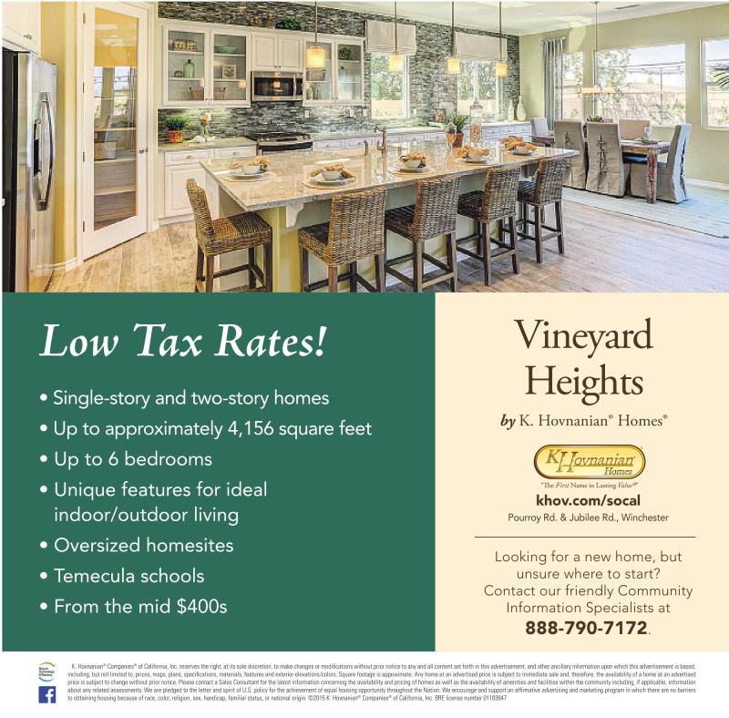Low Tax Rates! Vineyard • Single-story and two-story homes • Up to approximately 4,156 square feet • Up to 6 bedrooms • Unique features for ideal indoor/outdoor living • Oversized homesites • Temecula schools • From the mid $400s Heights by K. Hovnanian® Homes® khov.com/socal Pourroy Rd. & Jubilee Rd., Winchester Looking for a new home, but unsure where to start? Contact our friendly Community Information Specialists at 888-790-7172. K. Hovnanian ® Companies ® of California,Inc. reserves theright, at its sole discretion, to make changes or modifications without priornoticetoany andall contentset forth in thisadvertisement,and other ancillary information upon whichthis advertisement is based, including, but not limited to,prices, maps, plans, specifications, materials, features andexteriorelevations/colors.Squarefootageisapproximate. Any homeatanadvertised priceissubjecttoimmediate sale and, therefore, the availability of ahomeatanadvertised priceissubject to change without priornotice.Please contactaSales Consultantfor thelatest information concerning the availability and pricing of homes as well as the availability of amenities and facilities within the community including, if applicable, information aboutany relatedassessments. We are pledged to the letter andspirit of U.S. policy forthe achievement of equalhousingopportunity throughout the Nation. We encourageand supportanaffirmative advertising and marketing program in whichthere arenobarriers to obtaining housing because of race,color,religion, sex, handicap, familial status, or national origin. ©2015 K. Hovnanian ® Companies ® of California, Inc. BRE license number 01183847