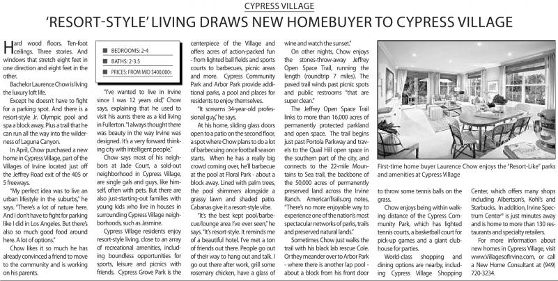 In April, Chowpurchasedanew home in Cypress Village,partofthe Villages of Irvine located just off the Jeffrey Road exit of the 405 or 5freeways.