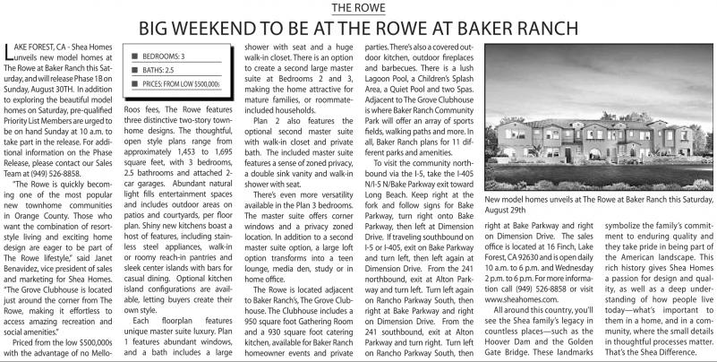 fOREsT,CA-shea Homes unveils new model homes at TheRoweatBaker Ranch this saturday, andwillreleasePhase1Bon sunday, August 30TH. In addition to exploring the beautiful model homes on saturday, pre-qualified PriorityList Members areurged to be on hand sunday at 10 a.m. to take part in the release. for additional information on the Phase Release, please contact our sales Team at (949) 526-8858.