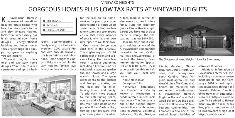 . Hovnanian® Homes® has answered the call for beautiful estate homes with lots of outdoor space to run and play. vineyard Heights, located in french valley, has it all: beautiful open home designs, energy-efficient building and huge homesites large enough for a pool, putting green or anything you can imagine.
