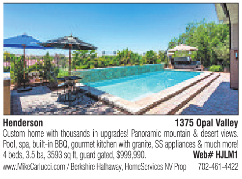 Henderson 1375 Opal Valley www.MikeCarlucci.com /BerkshireHathaway,HomeServices NV Prop 702-461-4422 Custom home with thousands in upgrades! Panoramic mountain &desert views. Pool, spa, built-in BBQ, gourmetkitchen with granite, SS appliances &much more! 4beds, 3.5ba, 3593 sq ft, guardgated, $999,990. Web# HJLM1
