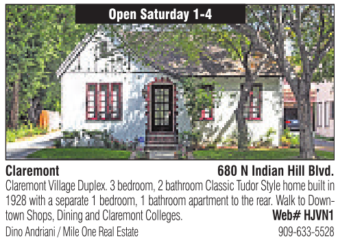 Claremont Open Saturday 1-4 680 NIndian Hill Blvd. Claremont VillageDuplex. 3bedroom, 2bathroomClassic Tudor Stylehome built in 1928with aseparate 1bedroom, 1bathroom apartmenttothe rear.Walk to Downtown Shops,Dining and ClaremontColleges. Web# HJVN1 Dino Andriani /Mile One Real Estate 909-633-5528 See also