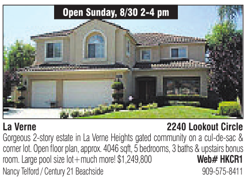 La Verne Open Sunday, 8/30 2-4 pm 2240 Lookout Circle Nancy Telford/Century 21 Beachside 909-575-8411 Gorgeous 2-story estate in La Verne Heights gated community onacul-de-sac & corner lot. Open floor plan, approx.4046 sqft, 5bedrooms,3baths &upstairs bonus room.Large poolsize lot+much more! $1,249,800 Web# HKCR1
