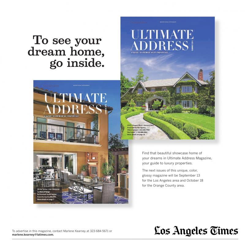 To see your dream home, go inside. To advertise in this magazine, contact Marlene Kearney at 323-684-5671 or marlene.kearney@latimes.com. Find that beautiful showcase home of your dreams in Ultimate Address Magazine, your guide to luxury properties. The next issues of this unique, color, glossy magazine will be September 13 for the Los Angeles area and October 18 for the Orange County area.