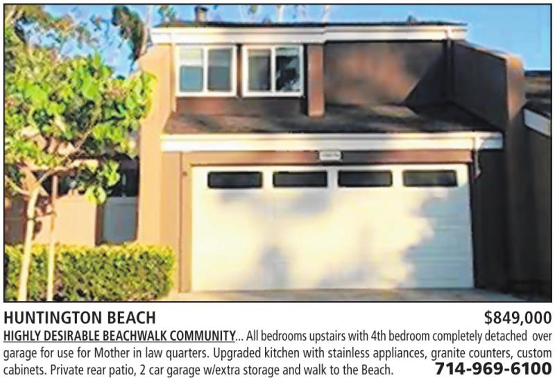 HUNTINGTON BEACH $849,000 HIGHLY DESIRABLEBEACHWALK COMMUNITY... Allbedrooms upstairswith4th bedroom completelydetached over garage for use for Mother in law quarters. Upgraded kitchen with stainless appliances, granite counters, custom cabinets.Privaterear patio, 2car garage w/extrastorageand walk to theBeach. 714-969-6100