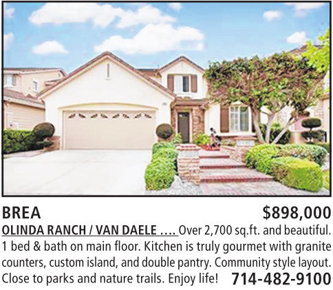 BREA $898,000 OLINDA RANCH/VAN DAELE …. Over 2,700sq.ft.and beautiful. 1bed &bathonmainfloor. Kitchen is truly gourmetwithgranite counters, customisland,and double pantry.Community style layout. Close to parksand naturetrails. Enjoy life! 714-482-9100