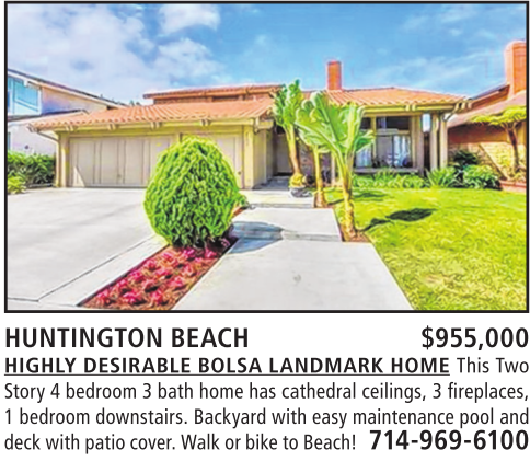 HUNTINGTON BEACH $955,000 HIGHLY DESIRABLE BOLSA LANDMARK HOME This Two Story 4bedroom 3bath home has cathedral ceilings, 3fireplaces, 1bedroom downstairs. Backyard with easy maintenance pool and deck with patiocover.Walk or biketoBeach! 714-969-6100