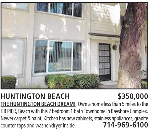 HUNTINGTON BEACH $350,000 THEHUNTINGTONBEACH DREAM! Ownahome less than 5miles to the HB PIER, Beachwiththis 2bedroom1bath Townhome in Bayshore Complex. Newercarpet&paint, Kitchen has newcabinets, stainless appliances, granite countertops andwasher/dryer inside. 714-969-6100