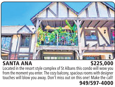 SANTA ANA $225,000 Located in theresortstyle complexofStAlbansthis condowill wow you from themoment youenter.The cozy balcony,spacious rooms with designer toucheswill blow youaway.Don’t missout on this one!Makethe call!