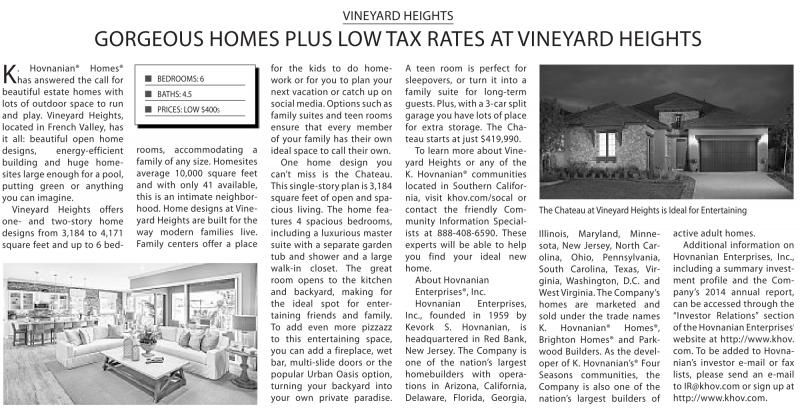 . Hovnanian® Homes® has answered the call for beautiful estate homes with lots of outdoor space to run and play. vineyard Heights, located in french valley, has it all: beautiful open home designs, energy-efficient building and huge homesites large enough for a pool, putting green or anything you can imagine.