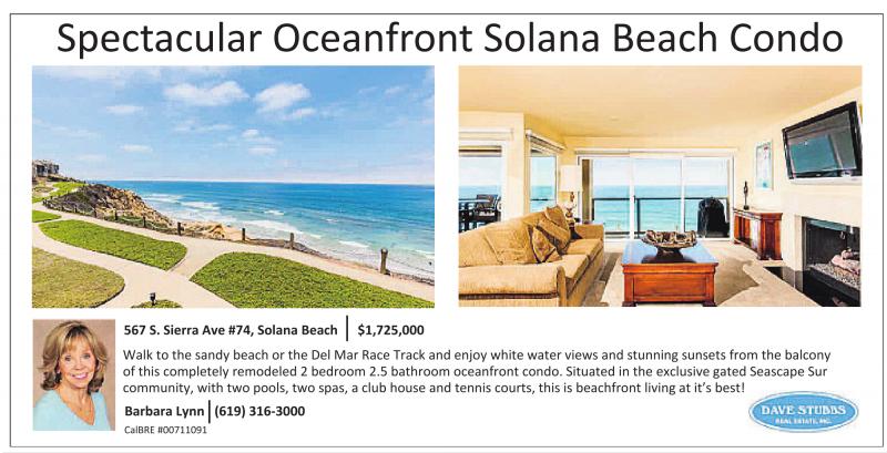 Spectacular Oceanfront Solana Beach Condo 567 S. Sierra Ave #74, Solana Beach $1,725,000 Walk to the sandy beach or the Del Mar Race Track and enjoy white water views and stunning sunsets from the balcony of this completely remodeled 2 bedroom 2.5 bathroom oceanfront condo. Situated in the exclusive gated Seascape Sur community, with two pools, two spas, a club house and tennis courts, this is beachfront living at it’s best! Barbara Lynn (619) 316-3000 CalBRE #00711091