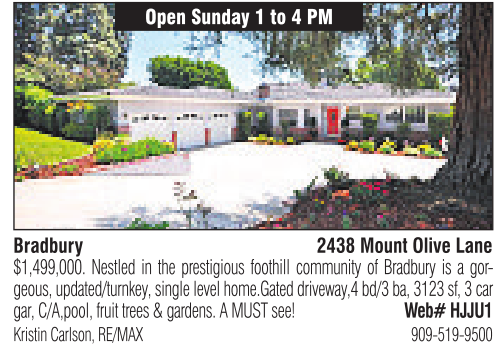 Bradbury Open Sunday 1to4PM 2438 Mount Olive Lane Kristin Carlson, RE/MAX 909-519-9500 $1,499,000. Nestled inthe prestigious foothill community of Bradbury is a gorgeous, updated/turnkey,singlelevel home.Gated driveway,4 bd/3ba, 3123 sf,3car gar, C/A,pool,fruit trees &gardens.AMUST see! Web# HJJU1