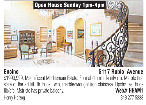 Encino Open House Sunday 1pm-4pm 5117 Rubio Avenue state of the art kit, flrtoceil win, marble/wrought iron staircase. Upstrs feat huge $1999,999. Magnificent MediterreanEstate. Formal dinrm, family rm. Marbleflrs, lib/ofc. Mstr stehas private balcony. Web# HHAM1 Henry Herzog 818 277 5233