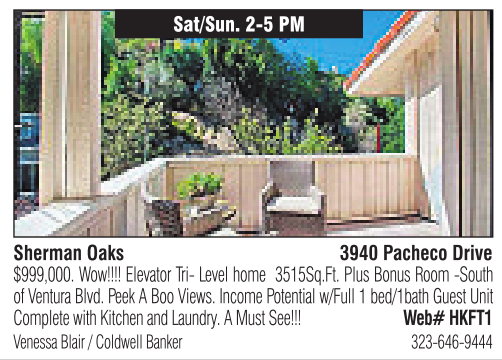 $999,000. Wow!!!! Elevator Tri- Level home 3515Sq.Ft.Plus BonusRoom -South of Ventura Blvd. Peek ABoo Views. Income Potential w/Full 1bed/1bath GuestUnit CompletewithKitchen and Laundry. AMustSee!!! Web# HKFT1