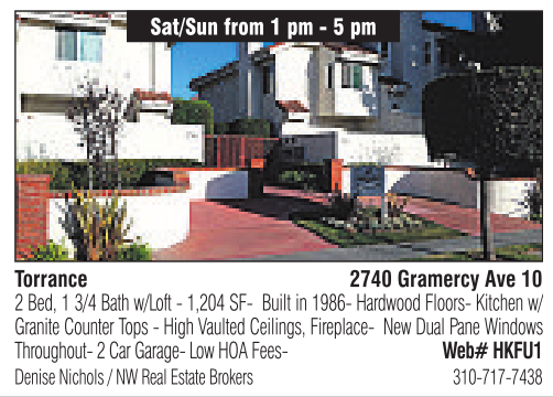 Sat/Sun from 1pm-5pm Torrance 2740 Gramercy Ave 10 2Bed, 13/4 Bath w/Loft -1,204 SF- Builtin1986- Hardwood Floors- Kitchen w/ GraniteCounter Tops -High Vaulted Ceilings, Fireplace- New Dual Pane Windows Throughout-2Car Garage- LowHOA Fees- Web# HKFU1 Denise Nichols /NWReal Estate Brokers 310-717-7438