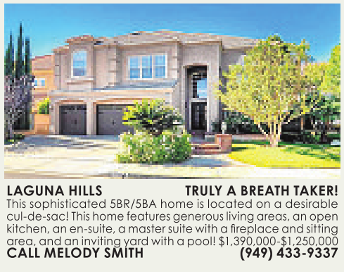 LAGUNA HILLS TRULY ABREATH TAKER! This sophisticated 5BR/5BA home is located onadesirable cul-de-sac! This homefeaturesgenerous living areas, an open kitchen, an en-suite,amaster suitewithafireplace andsitting area,and an inviting yard with apool! $1,390,000-$1,250,000 CALL MELODY SMITH (949) 433-9337