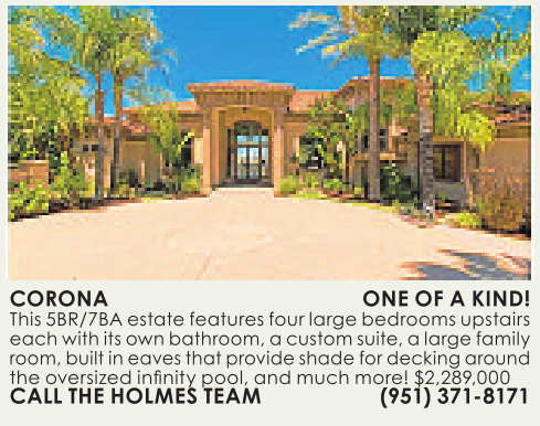 This5BR/7BA estate features four largebedroomsupstairs eachwithits ownbathroom, acustomsuite,alargefamily room,built in eaves that provide shade fordecking around the oversized infinity pool, and much more! $2,289,000 CALL THE HOLMES TEAM (951) 371-8171