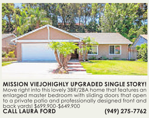 MISSION VIEJOHIGHLY UPGRADED SINGLE STORY! Move right intothis lovely 3BR/2BAhome that features an enlarged master bedroom with sliding doors that open to aprivate patio and professionally designed front and back yards! $699,900-$649,900 CALL LAURA FORD (949) 275-7762