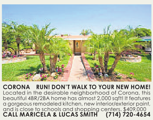CORONA RUN! DON’T WALK TO YOUR NEW HOME! Located inthe desirable neighborhood of Corona, this beautiful4BR/2BA home hasalmost2,000 sqft!Itfeatures agorgeousremodeled kitchen, newinterior/exteriorpaint, and isclose to schools and shopping centers. $409,000 CALL MARICELA &LUCAS SMITH (714) 720-4654