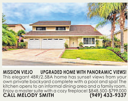 kitchenopenstoaninformaldiningareaand afamilyroom. Enjoyamastersuite with acozyfireplace!$848,500-$799,000 CALL MELODY SMITH (949) 433-9337 MISSION VIEJO UPGRADED HOME WITH PANORAMIC VIEWS! This elegant 4BR/2.5BA home has sunset views from your ownprivate backyardcomplete with apooland spa! The