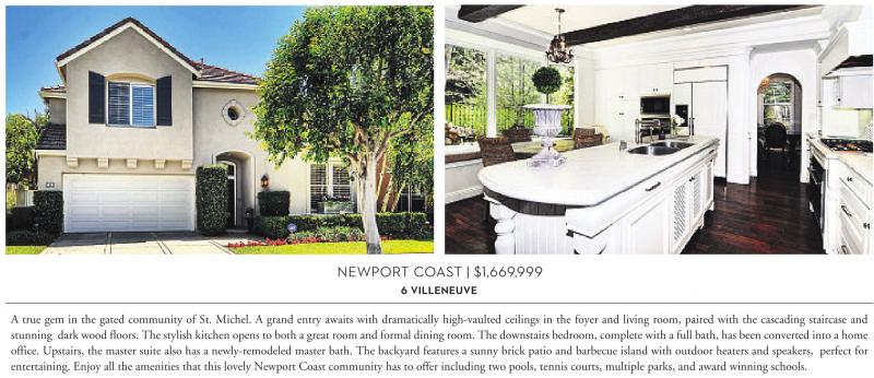 NEWPORT COAST | $1,669,999 6 VILLENEUVE A true gem in the gated community of St. Michel. A grand entry awaits with dramatically high-vaulted ceilings in the foyer and living room, paired with the cascading staircase and stunning dark wood floors. The stylish kitchen opens to both a great room and formal dining room. The downstairs bedroom, complete with a full bath, has been converted into a home office. Upstairs, the master suite also has a newly-remodeled master bath. The backyard features a sunny brick patio and barbecue island with outdoor heaters and speakers, perfect for entertaining. Enjoy all the amenities that this lovely Newport Coast community has to offer including two pools, tennis courts, multiple parks, and award winning schools.