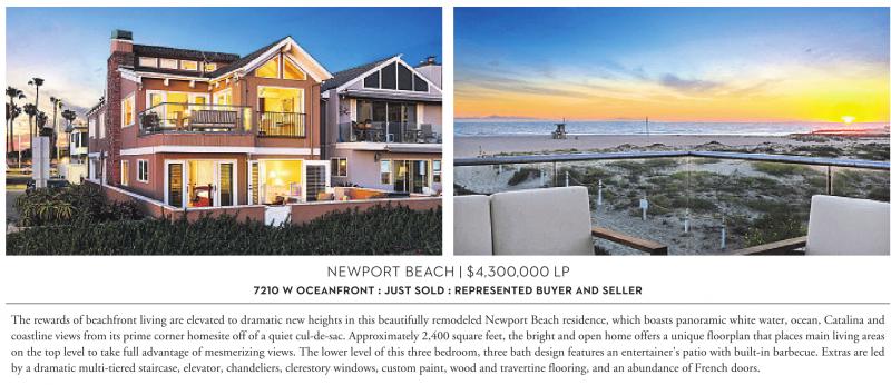 NEWPORT BEACH | $4,300,000 LP 7210 W OCEANFRONT : JUST SOLD : REPRESENTED BUYER AND SELLER The rewards of beachfront living are elevated to dramatic new heights in this beautifully remodeled Newport Beach residence, which boasts panoramic white water, ocean, Catalina and coastline views from its prime corner homesite off of a quiet cul-de-sac. Approximately 2,400 square feet, the bright and open home offers a unique floorplan that places main living areas on the top level to take full advantage of mesmerizing views. The lower level of this three bedroom, three bath design features an entertainer's patio with built-in barbecue. Extras are led by a dramatic multi-tiered staircase, elevator, chandeliers, clerestory windows, custom paint, wood and travertine flooring, and an abundance of French doors.