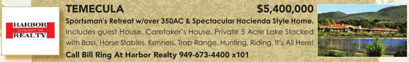 TEMECULA $5,400,000 Sportsman’s Retreat w/over 350AC & Spectacular Hacienda Style Home. Includes guest House, Caretaker’s House, Private 5 Acre Lake Stocked with Bass, Horse Stables, Kennels, Trap Range, Hunting, Riding, It’s All Here! Call Bill Ring At Harbor Realty 949-673-4400 x101