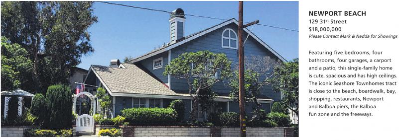 NEWPORT BEACH 129 31 st Street $18,000,000 Please ContactMark &Nedda forShowings Featuring five bedrooms, four bathrooms, four garages, a carport and a patio, this single-family home is cute, spacious and has high ceilings. The iconic Seashore Townhomes tract is close to the beach, boardwalk, bay, shopping, restaurants, Newport and Balboa piers, the Balboa fun zone and the freeways. See also