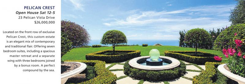 PELICAN CREST Open House Sat 12-5 23 Pelican Vista Drive $26,000,000 Located on the front row of exclusive Pelican Crest, this custom estate is an elegant mix of contemporary and traditional flair. Offering seven bedroom suites, including a spacious master retreat and a separate wing with three bedrooms joined by a bonus room. A perfect compound by the sea.