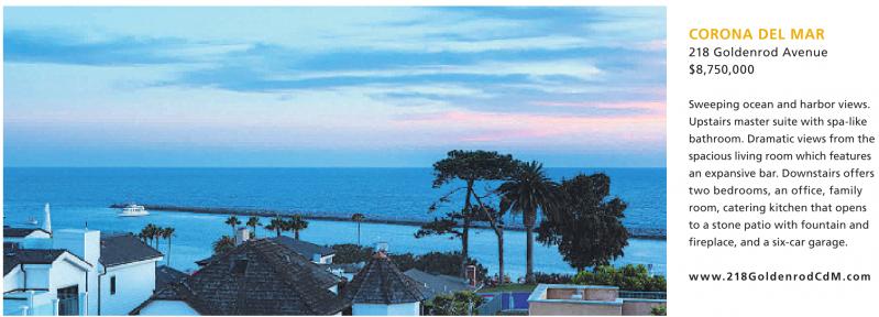 CORONA DEL MAR 218 Goldenrod Avenue $8,750,000 Sweeping ocean and harbor views. Upstairs master suite with spa-like bathroom. Dramatic views from the spacious living room which features an expansive bar. Downstairs offers two bedrooms, an office, family room, catering kitchen that opens to a stone patio with fountain and fireplace, and a six-car garage. www.218GoldenrodCdM.com See also
