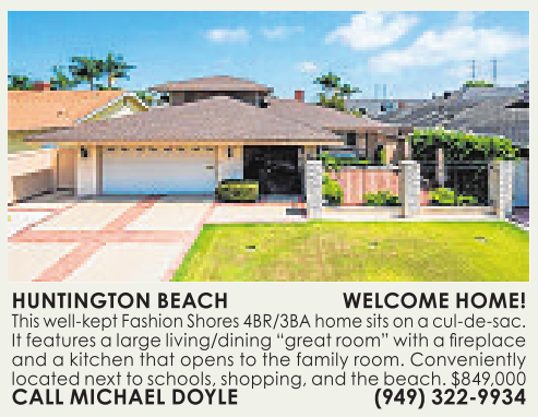 HUNTINGTON BEACH WELCOME HOME! This well-keptFashion Shores 4BR/3BAhome sits on acul-de-sac. It features alarge living/dining“greatroom” with afireplace and akitchen that opens tothe family room. Conveniently locatednexttoschools,shopping,and thebeach. $849,000 CALL MICHAEL DOYLE (949) 322-9934 See also