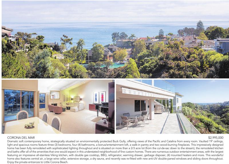 CORONA DEL MAR $2,995,000 Dramatic soft contemporary home, strategically situated on environmentally protected Buck Gully, offering views of the Pacific and Catalina from every room. Vaulted 19’ ceilings, light and spacious rooms feature three (3) bedrooms, four (4) bathrooms, a bonus/entertainment loft, a walk-in pantry and two wood-burning fireplaces. This impressively designed home has been fully remodeled with sophisticated lighting throughout and is situated on more than a 2/3 acre lot (from the cul-de-sac down to the stream), the remodeled kitchen andbaths offer all of theamenities thatone would expect in this understatedneighborhood of fine customhomes. There are numerous outdoor entertainment areas, withthe largest featuring an impressive all-stainless Viking kitchen, with double gas cooktop, BBQ, refrigerator, warming drawer, garbage disposer, (4) mounted heaters and more. This wonderful home also features central air, a large wine cellar, extensive storage, a dry sauna, and recently was re-fitted with new anti-UV double-paned windows and sliding doors throughout. Enjoy the private entrances to Little Corona Beach.