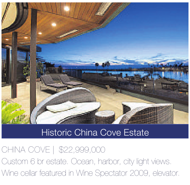 CHINA COVE | $22,999,000 Custom 6 br estate. Ocean, harbor, city light views. Wine cellar featured in Wine Spectator 2009, elevator.