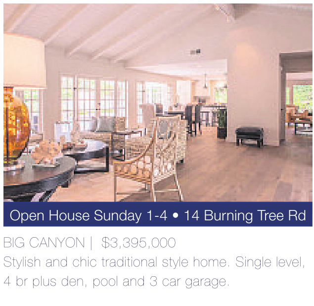 Open House Sunday 1-4 • 14 Burning Tree Rd BIG CANYON | $3,395,000 Stylish and chic traditional style home. Single level, 4 br plus den, pool and 3 car garage.