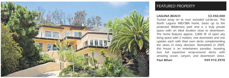 LAGUNA BEACH $3,450,000 Tucked away on its own secluded cul-de-sac. This North Laguna 4BD/3BA home, backs up to the protected Wilderness park and is a truly private space with an ideal location close to downtown. The home features approx. 3,800 SF of open airy living space with 2 masters, one downstairs and one upstairs each with their own decks complementing the views in every direction. Remodeled in 2009, this house is an entertainers paradise, boasting two full expansive wrap-around decks with amazing ocean, canyon, and downtown views.