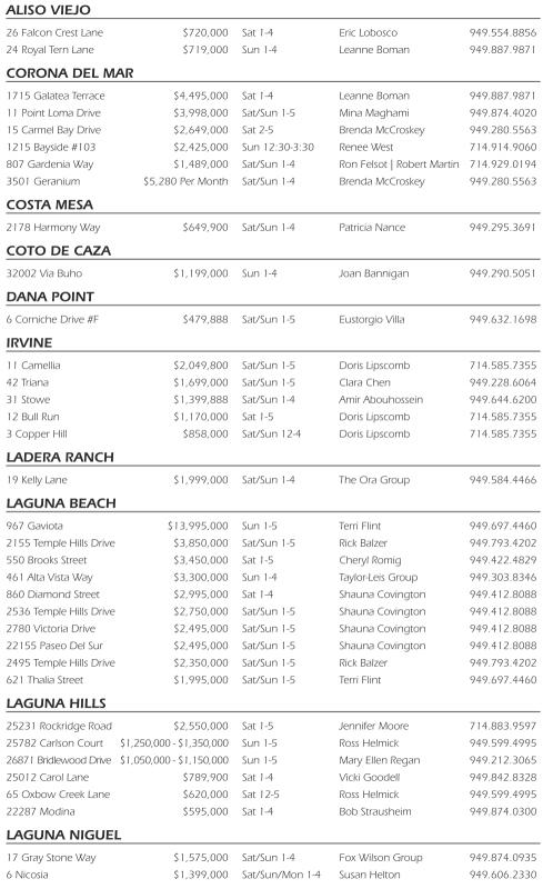 26 Falcon Crest Lane $720,000 Sat 1-4 Eric Lobosco 949.554.8856 24 Royal Tern Lane $719,000 Sun 1-4 Leanne Boman 949.887.9871 CORONA DEL MAR 1715 Galatea Terrace $4,495,000 Sat 1-4 Leanne Boman 949.887.9871 11 Point Loma Drive $3,998,000 Sat/Sun 1-5 Mina Maghami 949.874.4020 15 Carmel Bay Drive $2,649,000 Sat 2-5 Brenda McCroskey 949.280.5563 1215 Bayside #103 $2,425,000 Sun 12:30-3:30 Renee West 714.914.9060 807 Gardenia Way $1,489,000 Sat/Sun 1-4 Ron Felsot |Robert Martin 714.929.0194 3501 Geranium $5,280 Per Month Sat/Sun 1-4 Brenda McCroskey 949.280.5563 COSTA MESA 2178 Harmony Way $649,900 Sat/Sun 1-4 Patricia Nance 949.295.3691 COTO DE CAZA 32002 Via Buho $1,199,000 Sun 1-4 Joan Bannigan 949.290.5051 DANA POINT 6Corniche Drive #F $479,888 Sat/Sun 1-5 Eustorgio Villa 949.632.1698 IRVINE 11 Camellia $2,049,800 Sat/Sun 1-5 Doris Lipscomb 714.585.7355 42 Triana $1,699,000 Sat/Sun 1-5 Clara Chen 949.228.6064 31 Stowe $1,399,888 Sat/Sun 1-4 Amir Abouhossein 949.644.6200 12 Bull Run $1,170,000 Sat 1-5 Doris Lipscomb 714.585.7355 3Copper Hill $858,000 Sat/Sun 12-4 Doris Lipscomb 714.585.7355 LADERA RANCH 19 Kelly Lane $1,999,000 Sat/Sun 1-4 The Ora Group 949.584.4466 LAGUNA BEACH 967 Gaviota $13,995,000 Sun 1-5 Terri Flint 949.697.4460 2155 Temple Hills Drive $3,850,000 Sat/Sun 1-5 Rick Balzer 949.793.4202 550 Brooks Street $3,450,000 Sat 1-5 Cheryl Romig 949.422.4829 461 Alta Vista Way $3,300,000 Sun 1-4 Taylor-Leis Group 949.303.8346 860 Diamond Street $2,995,000 Sat 1-4 Shauna Covington 949.412.8088 2536 Temple Hills Drive $2,750,000 Sat/Sun 1-5 Shauna Covington 949.412.8088 2780 Victoria Drive $2,495,000 Sat/Sun 1-5 Shauna Covington 949.412.8088 22155 Paseo Del Sur $2,495,000 Sat/Sun 1-5 Shauna Covington 949.412.8088 2495 Temple Hills Drive $2,350,000 Sat/Sun 1-5 Rick Balzer 949.793.4202 621 Thalia Street $1,995,000 Sat/Sun 1-5 Terri Flint 949.697.4460 LAGUNA HILLS 25231 Rockridge Road $2,550,000 Sat 1-5 Jennifer Moore 714.883.9597 25782 Carlson Court $1,250,000 -$1,350,000 Sun 1-5 Ross Helmick 949.599.4995 26871 Bridlewood Drive $1,050,000 -$1,150,000 Sun 1-5 Mary Ellen Regan 949.212.3065 25012 Carol Lane $789,900 Sat 1-4 Vicki Goodell 949.842.8328 65 Oxbow Creek Lane $620,000 Sat 12-5 Ross Helmick 949.599.4995 22287 Modina $595,000 Sat 1-4 Bob Strausheim 949.874.0300 LAGUNA NIGUEL 17 Gray Stone Way $1,575,000 Sat/Sun 1-4 Fox Wilson Group 949.874.0935 6Nicosia $1,399,000 Sat/Sun/Mon 1-4 Susan Helton 949.606.2330