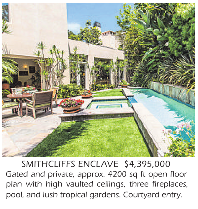 SMITHCLIFFS ENCLAVE $4,395,000 Gated and private, approx. 4200 sq ft open floor plan with high vaulted ceilings, three fireplaces, pool, and lush tropical gardens. Courtyard entry.