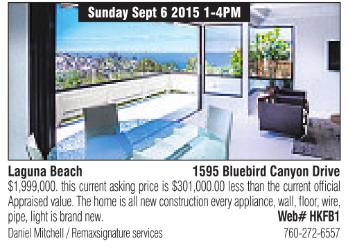 Sunday Sept 62015 1-4PM Laguna Beach 1595 Bluebird Canyon Drive Daniel Mitchell /Remaxsignatureservices 760-272-6557 $1,999,000. this current asking priceis$301,000.00 less thanthe current official Appraised value. The home is allnew construction every appliance, wall, floor,wire, pipe, light is brandnew. Web# HKFB1