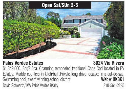 Open Sat/SUn 2-5 Palos Verdes Estates 3024 Via Rivera David Schwartz /KWPalos Verdes Realty 310-561-2295 $1,349,000. 3br/2.5ba. Charming remodeled traditional Cape Cod located inPV Estates. Marble counters inkitch/bath.Private long drive located; in acul-de-sac. Swimming pool, award winning school district. Web# HKBK1
