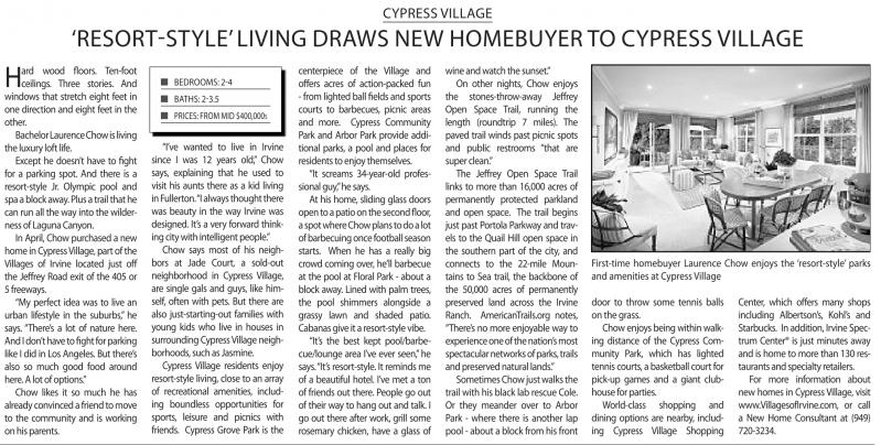 In April, Chowpurchasedanew home in Cypress Village,partofthe Villages of Irvine located just off the Jeffrey Road exit of the 405 or 5freeways.