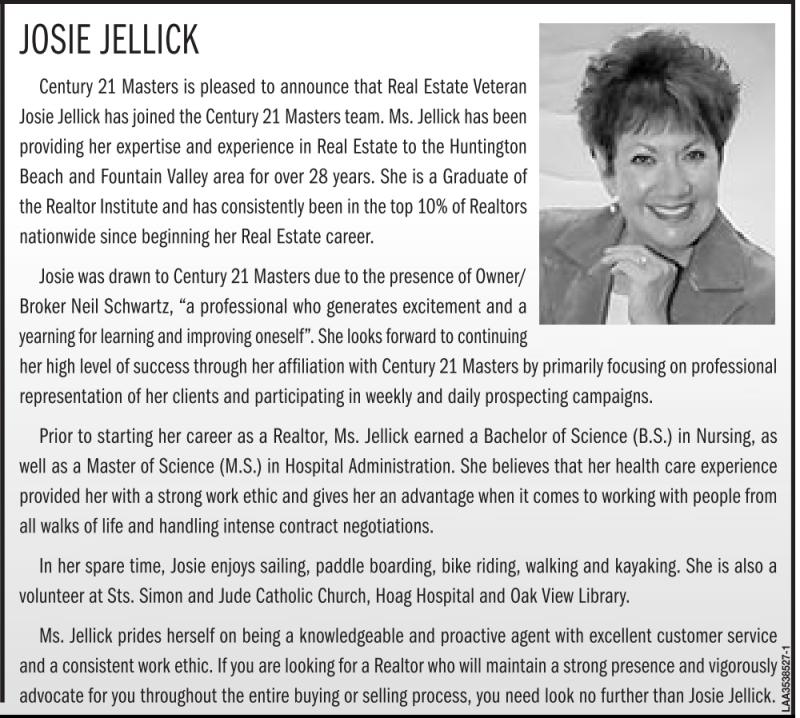 Century 21 Masters is pleased to announce that Real Estate Veteran JosieJellick hasjoinedthe Century21Mastersteam. Ms.Jellick hasbeen providing her expertise and experience in Real Estate to the Huntington Beach and Fountain Valley area for over 28 years. She is a Graduate of theRealtorInstitute andhas consistentlybeeninthe top10% of Realtors nationwide since beginning her Real Estate career.