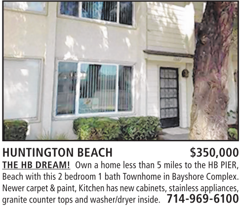 HUNTINGTON BEACH $350,000 THE HB DREAM! Own ahome less than 5miles tothe HB PIER, Beach withthis 2bedroom 1bathTownhome inBayshoreComplex. Newercarpet &paint, Kitchenhas new cabinets, stainless appliances, granitecounter tops andwasher/dryer inside. 714-969-6100