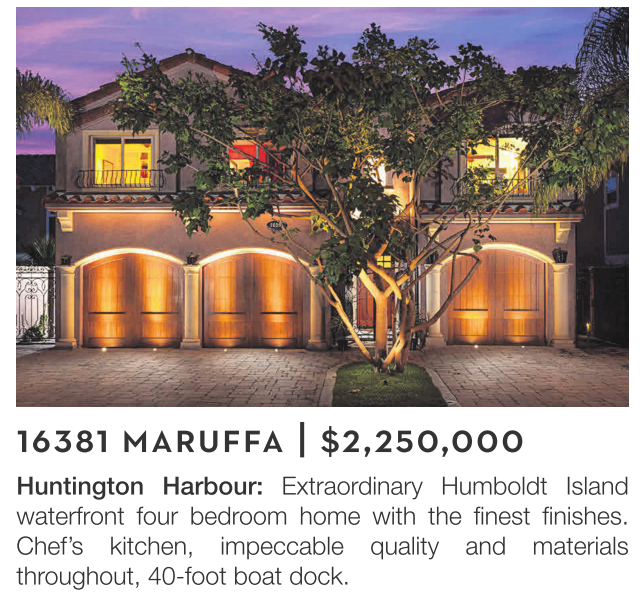 Huntington Harbour: Extraordinary Humboldt Island waterfront four bedroom home with the finest finishes. Chef’s kitchen, impeccable quality and materials throughout, 40-foot boat dock.
