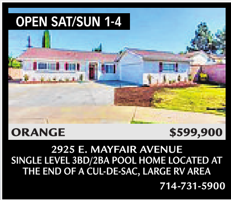 2925 E. MAYFAIR AVENUE SINGLE LEVEL 3BD/2BA POOL HOME LOCATED AT THE END OF ACUL-DE-SAC, LARGE RV AREA 714-731-5900